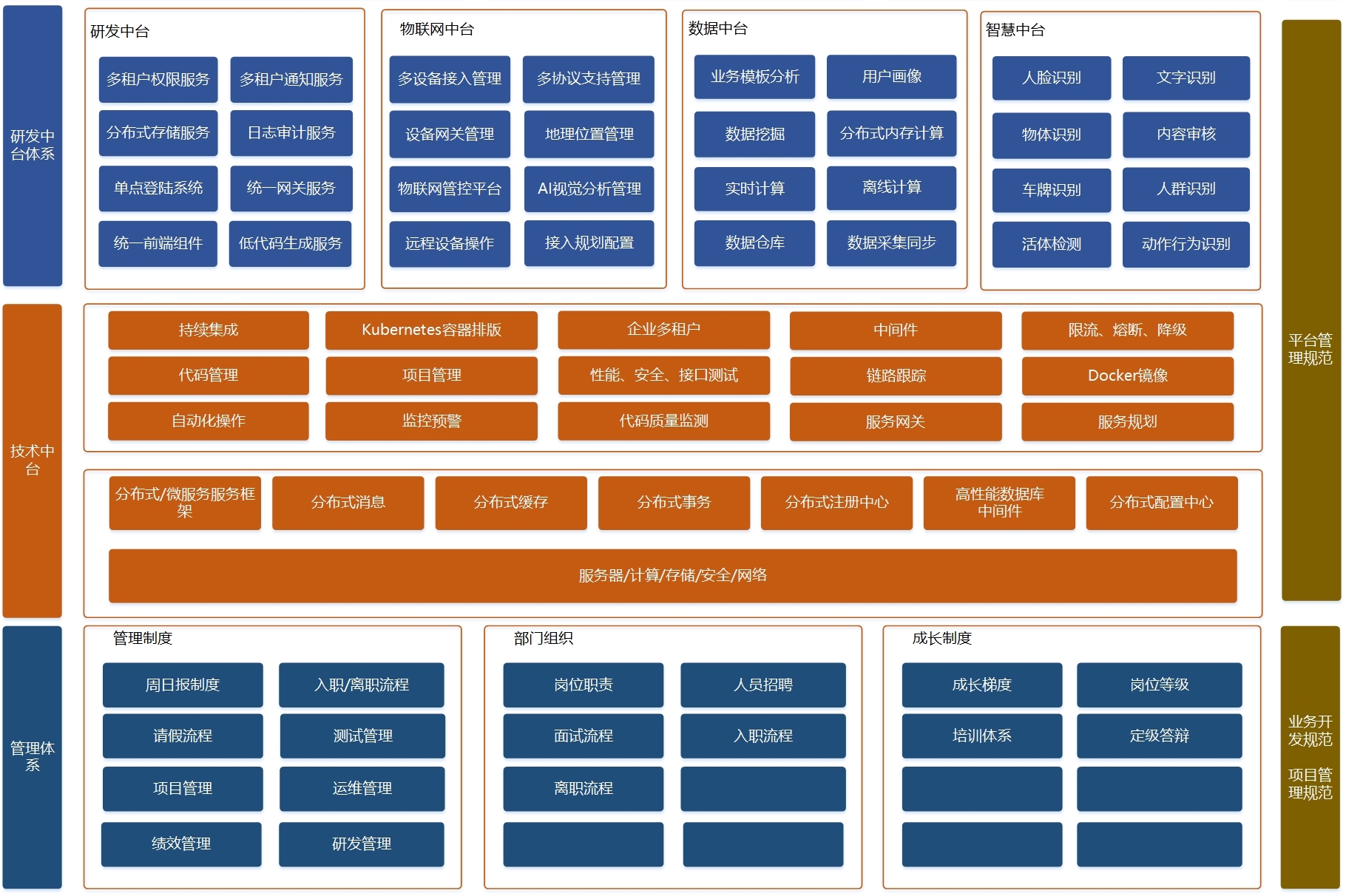 中臺體系是中臺能力的體現,集成管理和技術能力,為業務實現、創業提供快速和便利, 形成的對外能力,包括如下: